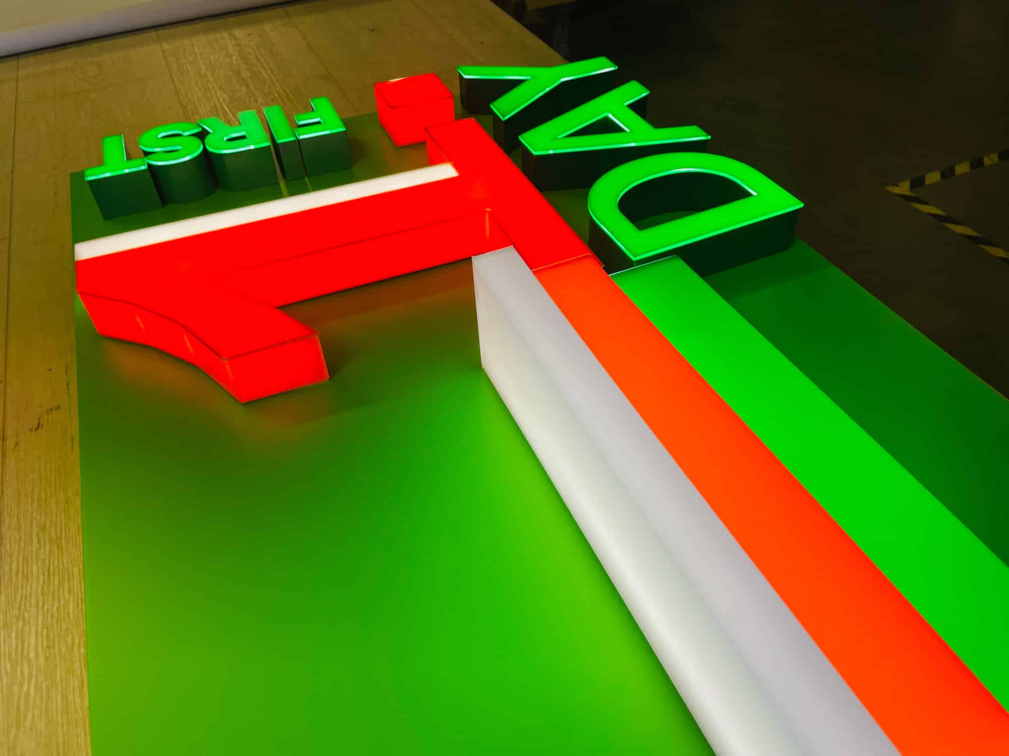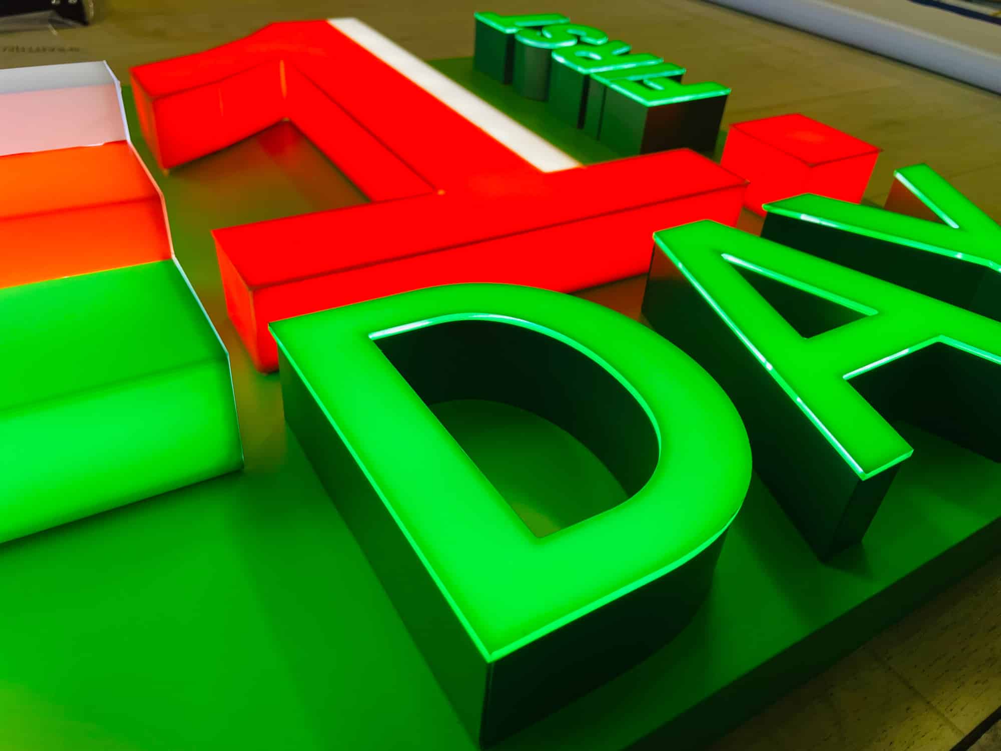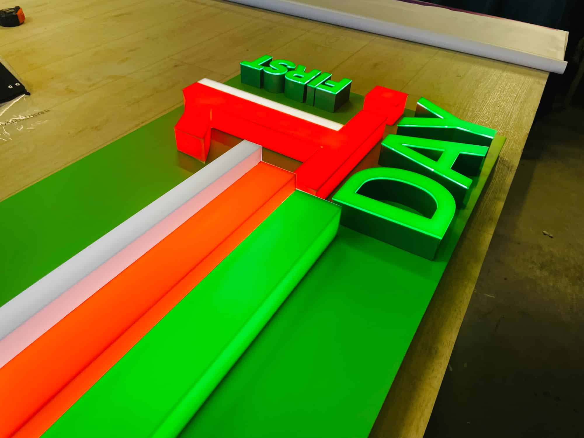 – The side and front of the letters are glued together as one unit, made of opal/coloured plexiglass or full polycarbonate with a translucent 7 year film adhered.